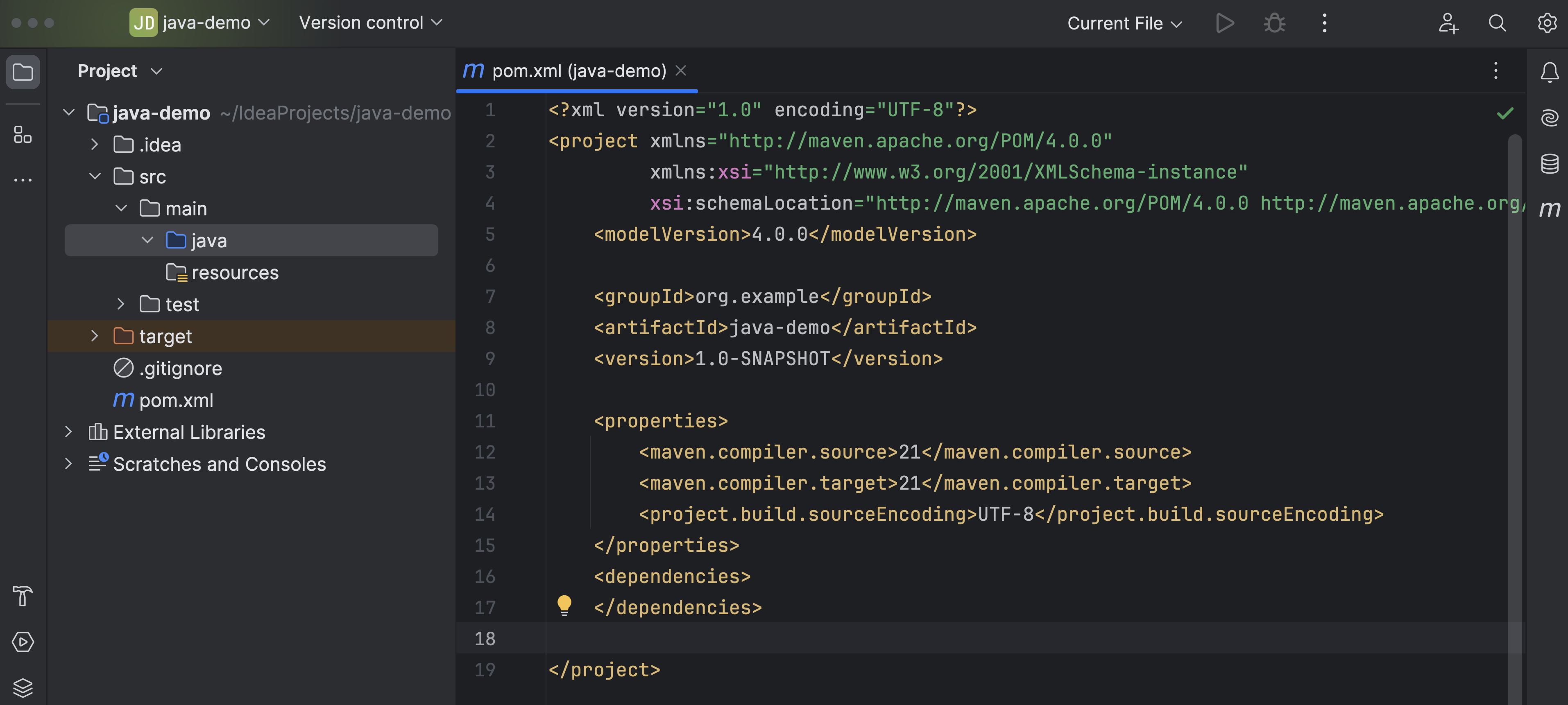 IntelliJ IDEA will create a project for you, with a basic pom.xml and a default directory structure for a Maven project with the source folder defined. The pom.xml is a file that contains information about the project and configuration details used by Maven to build the project. For more information, see the Maven documentation.