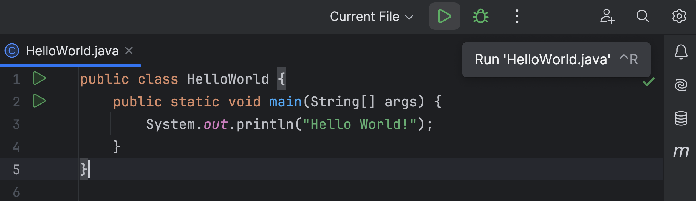 You can run the HelloWorld application directly from the editor, by clicking the green Run button in the gutter near the class declaration, or using the shortcut ⌃⇧R (on macOS) or Ctrl+Shift+F10 (on Windows/Linux).