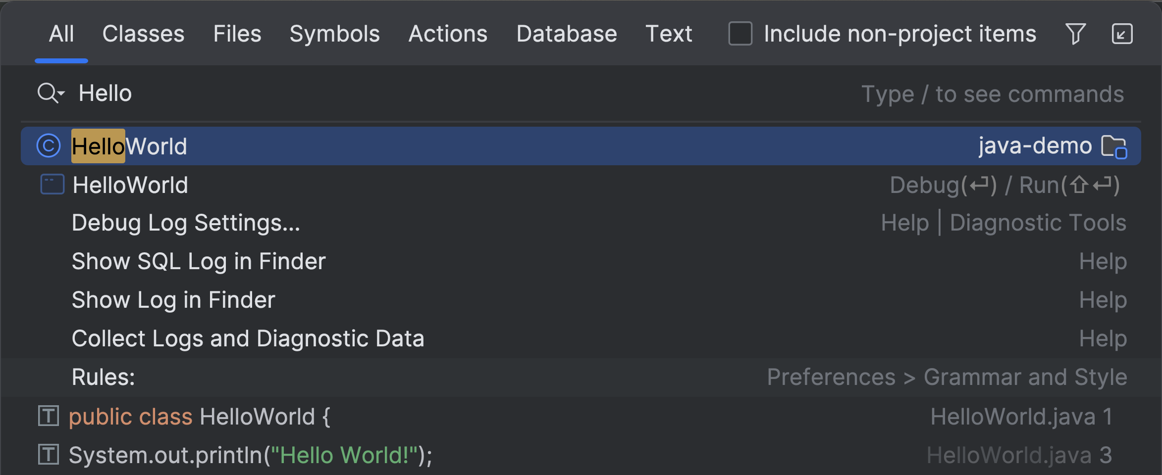 Another popular way to search is Find in Files. Open Find in Files from the main menu using Edit | Find | Find in Files, or by using the shortcut ⌘⇧F (on macOS) or Ctrl+Shift+F (on Windows/Linux). You can narrow down the results from In Project to Module, Directory, or Scope.